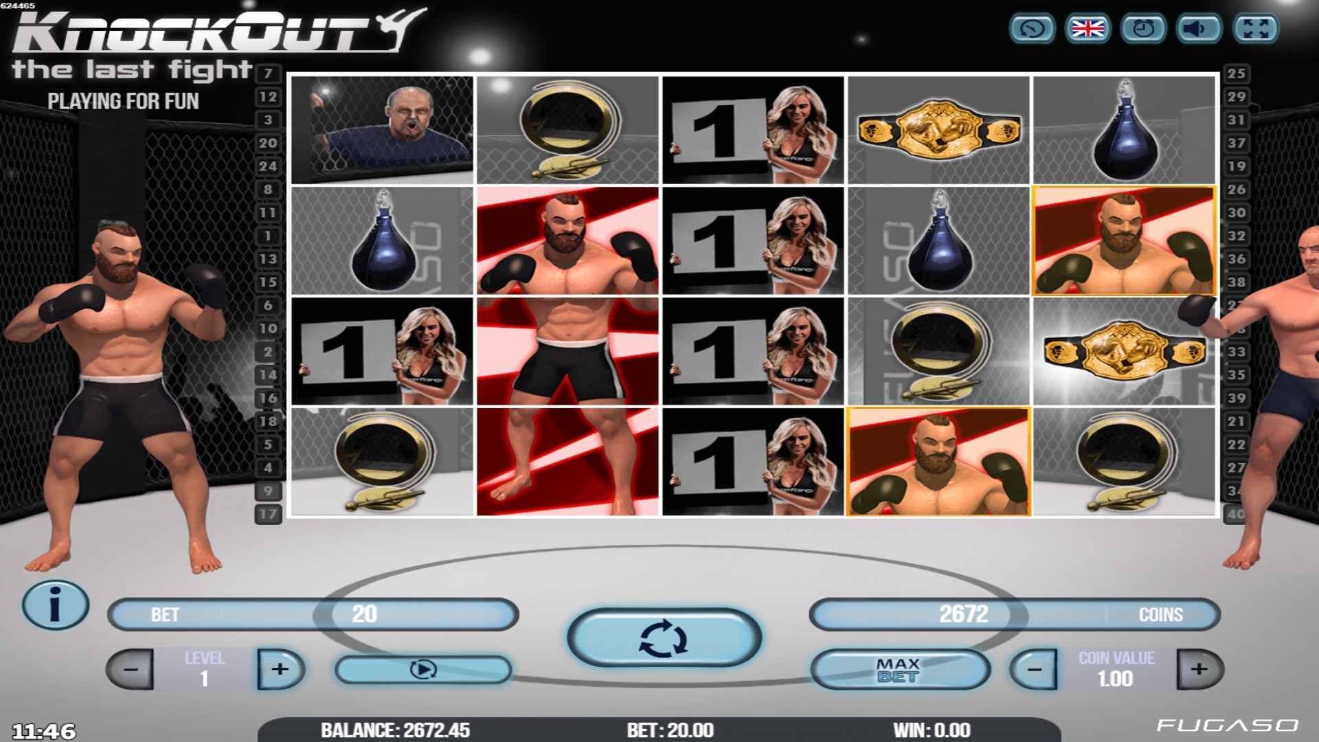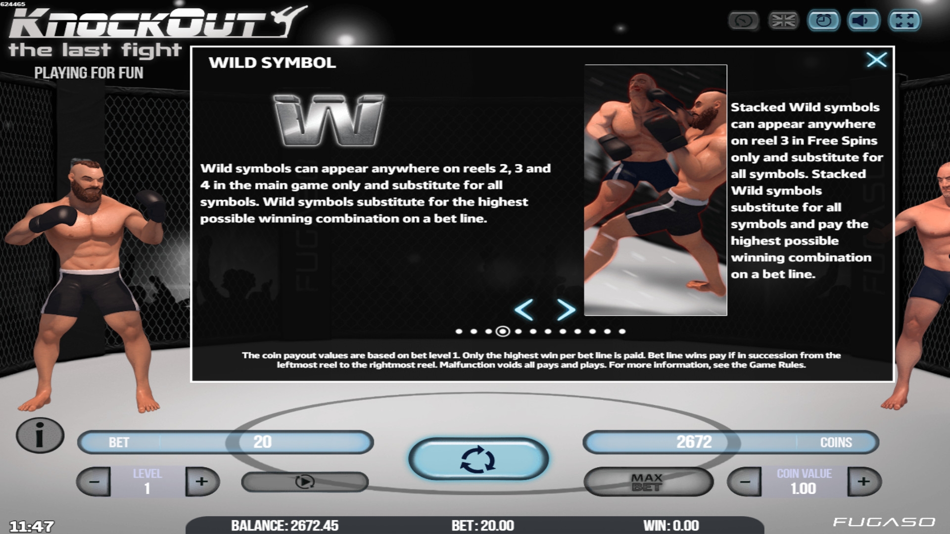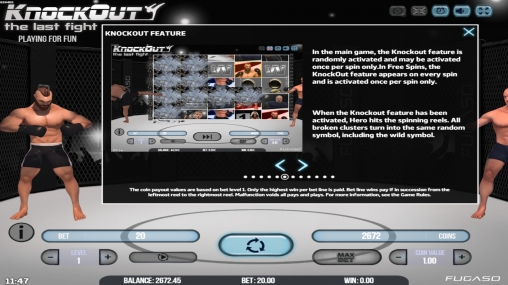 - Knockout Feature – Данная функция может запуститься в любом обычном или бесплатном спине. Боец наносит удары по вращающимся барабанам, превращая случайно выбранные ячейки в кластеры одинаковых картинок. В этих позициях могут появиться даже джокеры.