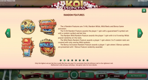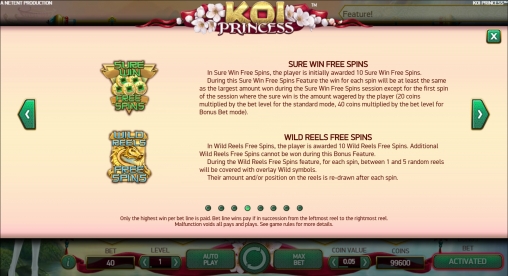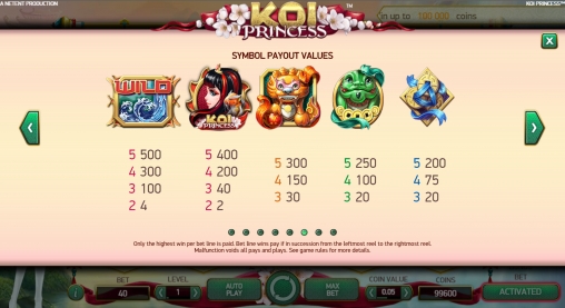 «Принцесса Кои» представляет собой слот с пятью барабанами и двадцатью неизменно задействованными полосами, на которых в процессе игры формируются оплачиваемые комбинации.