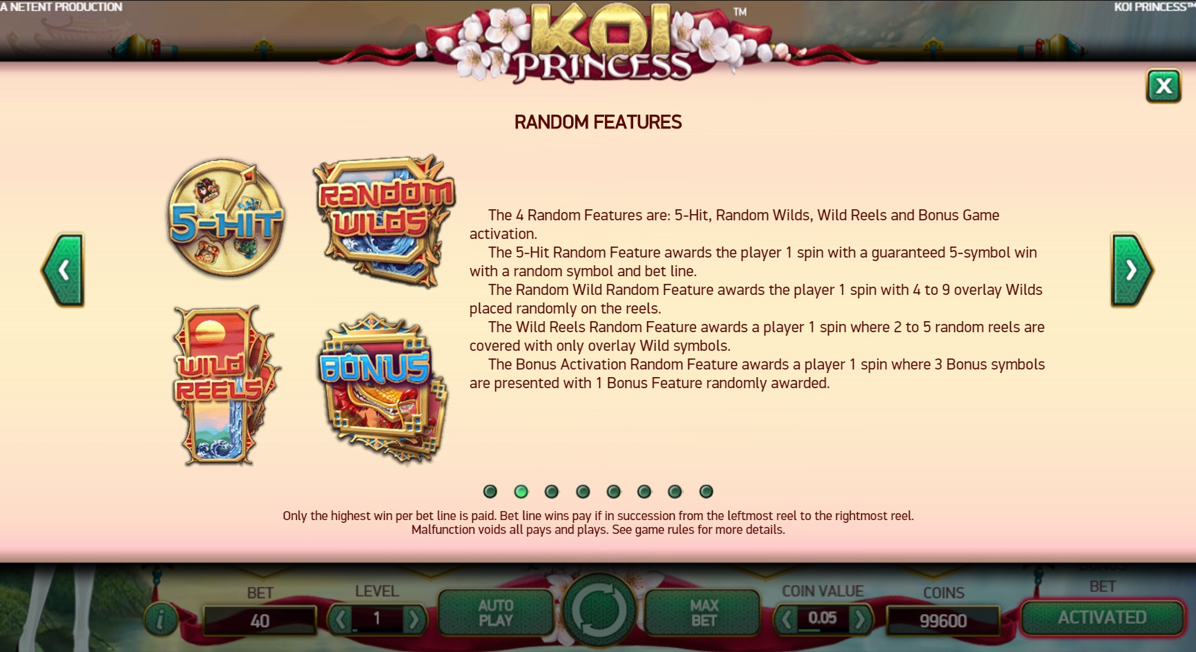 При игре по базовой ставке уровень теоретического возврата Koi Princess составляет 96%. Если сделать бонусную ставку, данный показатель увеличивается до 96,23%.