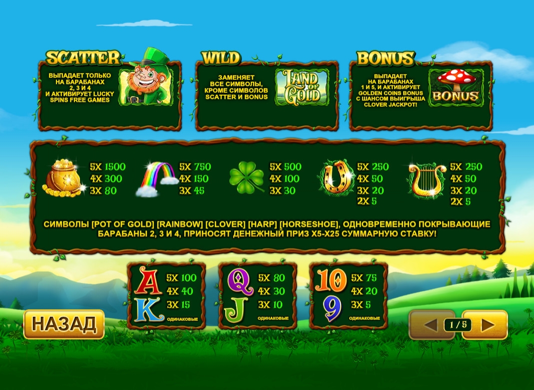 Картинки, изображенные на барабанах автомата «Золотая страна», полностью соответствуют тематике преданий о лепреконах. Вы увидите горшок с золотыми монетами, радугу, четырехлистный клевер, золотую подкову и арку, а также выдержанные в той же стилистике номиналы карт от девятки до туза.