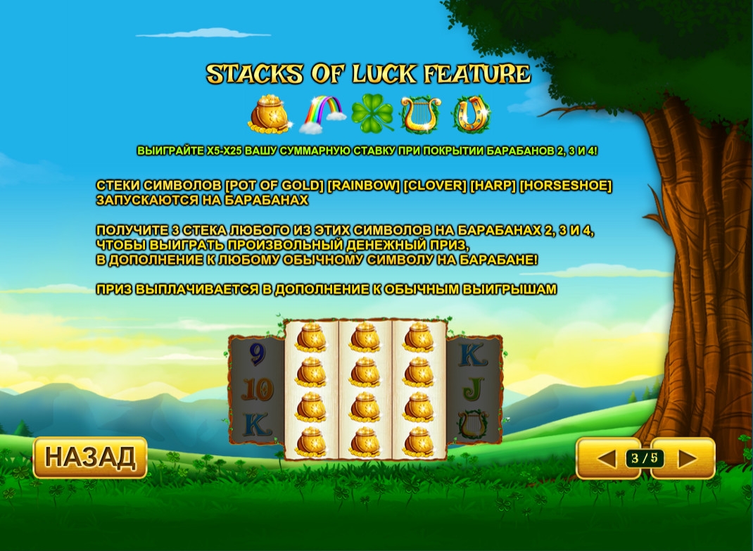 - Stacks of Luck – Изображения золотых монет, клевера, подковы, радуги и арфы могут идти полосами. Когда цепочки из любого такого символа занимают полностью три средние колонки, пользователь становится обладателем бонусной выплаты произвольного размера. Она дополняет все базовые выигрыши, если таковые имеются.