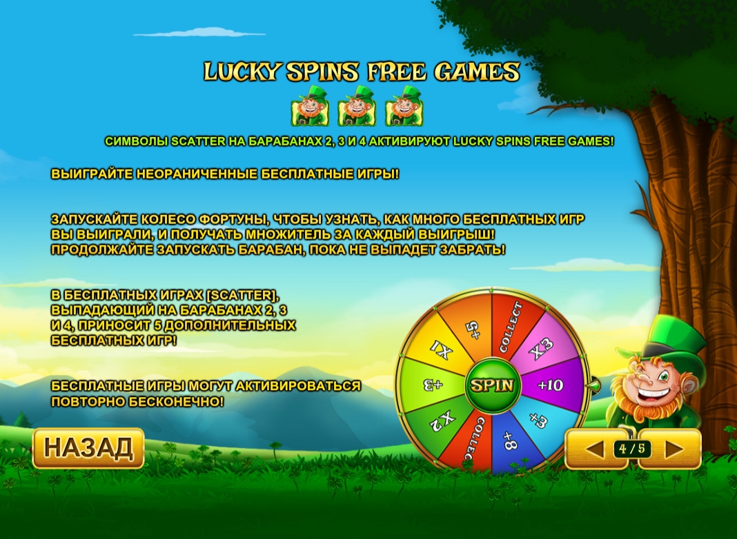 - Lucky Free Spins – Перед началом бесплатных вращений нужно запустить колесо фортуны на дополнительном экране. В его секторах написаны цифры, означающие количество спинов, дополнительные множители и слово Collect. Вы будете вращать барабан, собирая призовые опции, пока не попадется Collect. Затем начнутся бесплатные запуски по ставке прежнего размера, которую за вас будет делать казино. Фри-спины могут продолжаться неограниченное количество раз.