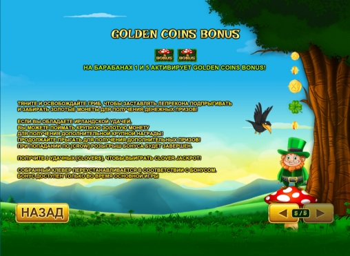 - Golden Coin Bonus – Игра начнется на дополнительном экране. Вы увидите лепрекона, стоящего на мухоморе. Вам нужно будет щелкнуть по грибу мышкой и потянуть его вверх, чтобы помочь главному герою подпрыгнуть. В воздухе он будет собирать монеты и лепестки клевера. Здесь же можно побороться за джекпот.