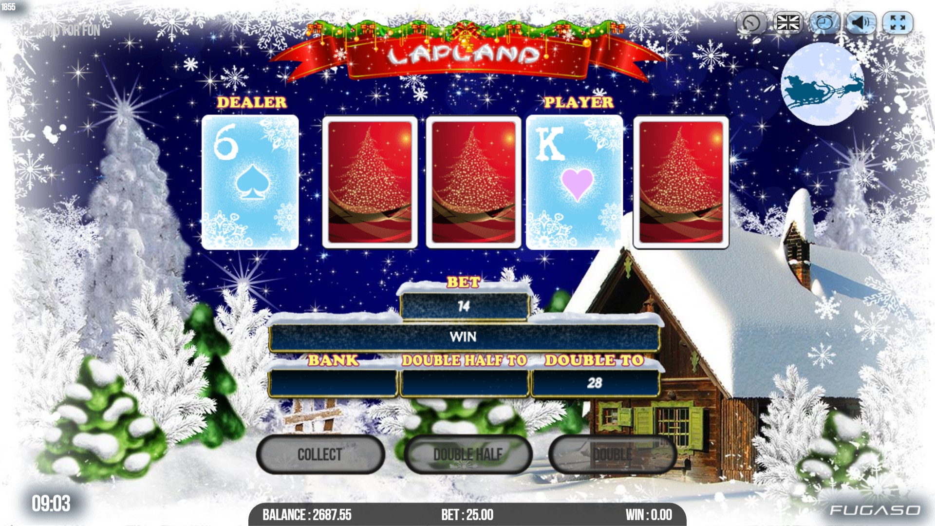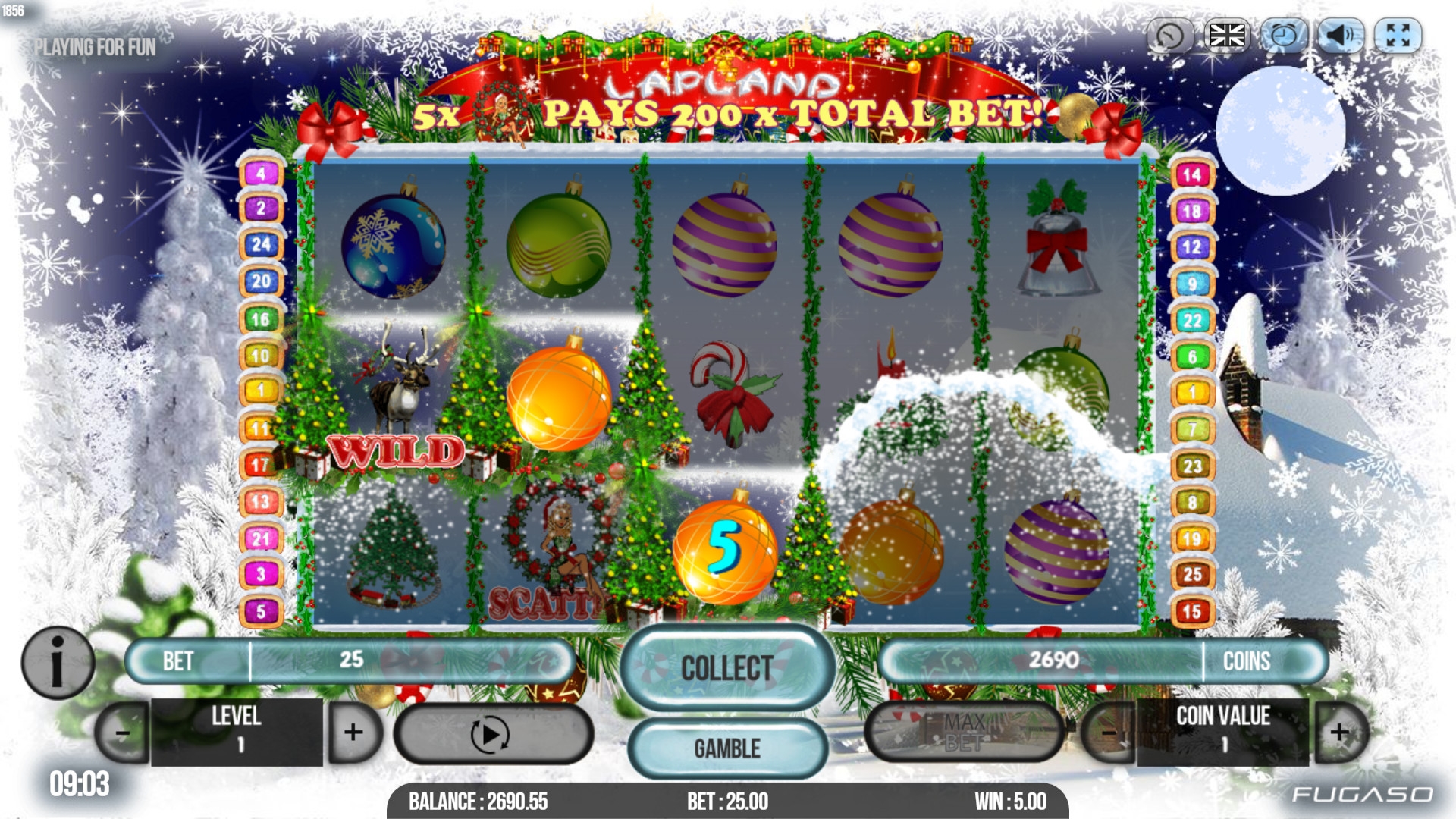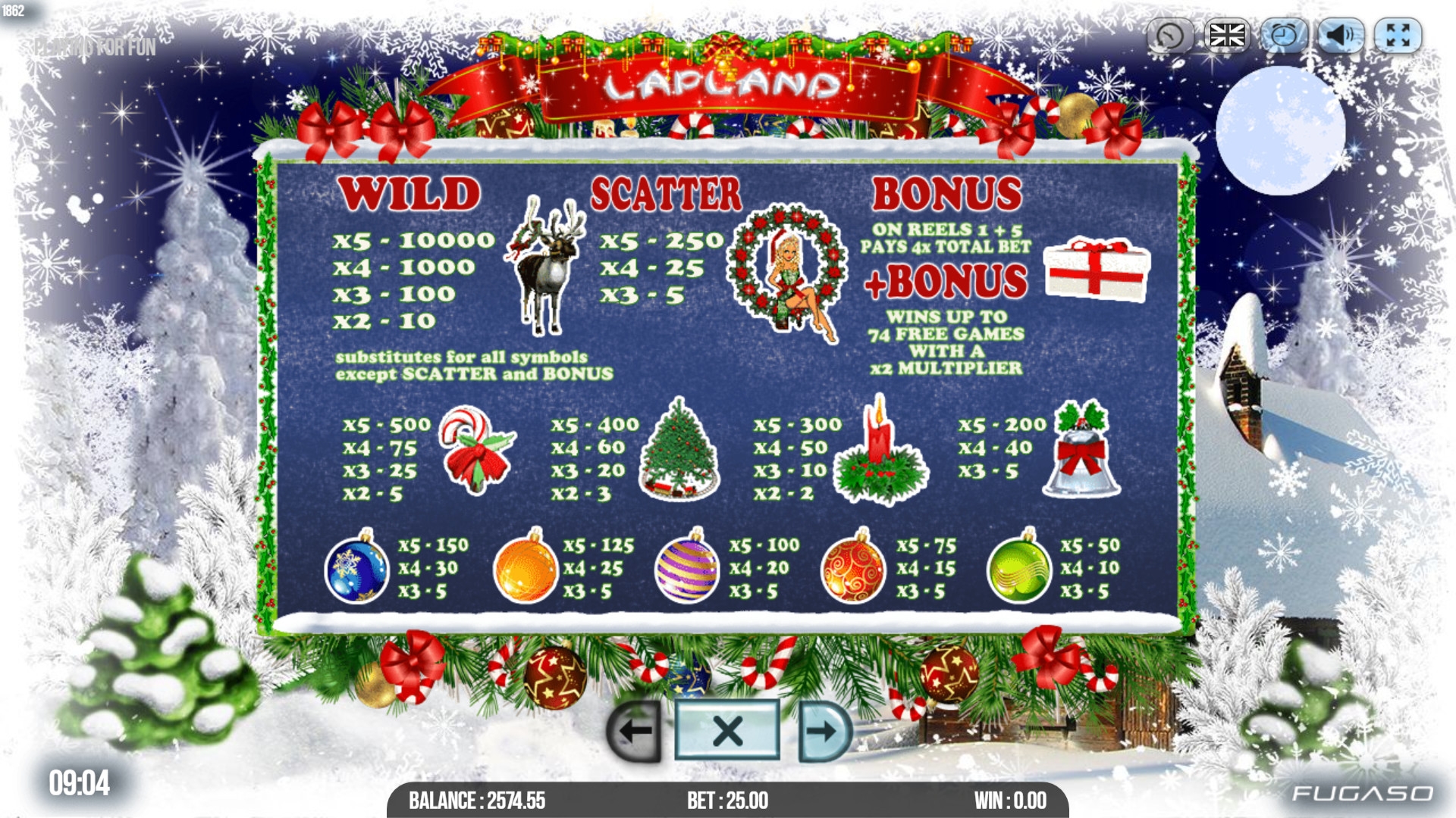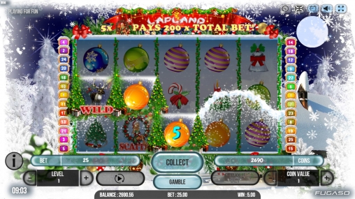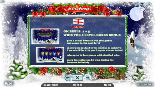 В Lapland представлены девять стандартных иконок, джокер, скаттер, бонусный символ, игра на удвоение, бесплатные вращения и призовые раунды.