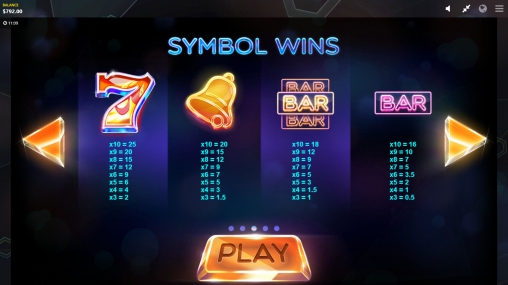 На барабанах изображены фрукты, BAR, колокольчики и семерки. Они имитируют вывески, сделанные из неоновых трубок. Одинаковые элементы часто следуют друг за другом в колонках, выпадая стеками.