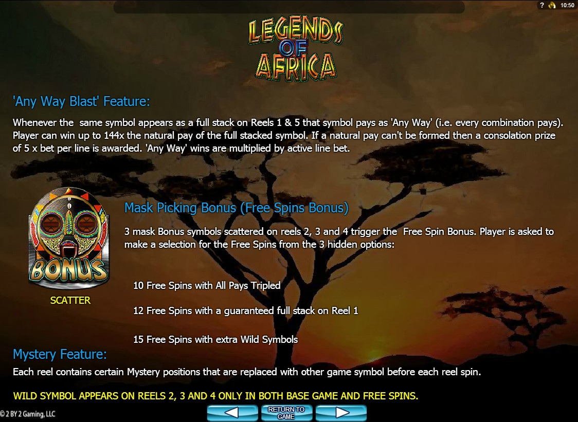 Набор предлагаемых в «Легендах Африки» игровых опций состоит из базовых картинок, особых символов, уникальной функции Any Way Blast, бонусного раунда Mystery и фри-спинов Mask Picking с дополнительными возможностями. Все они рассматриваются далее в статье.