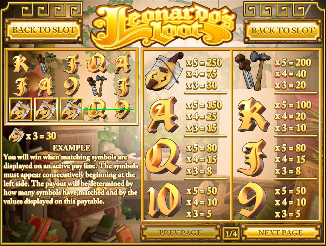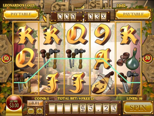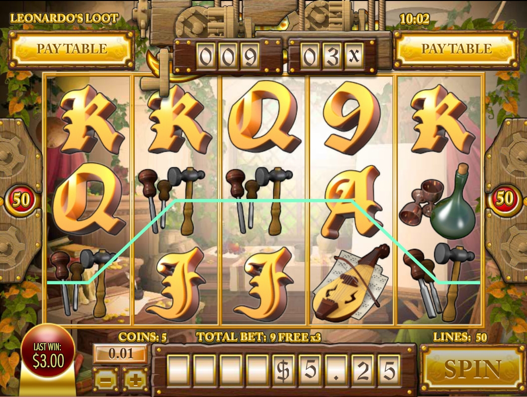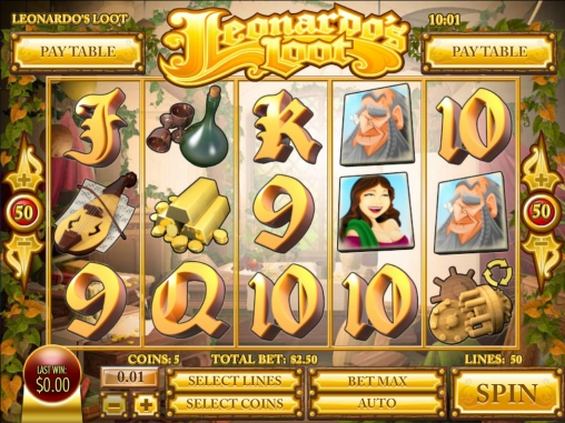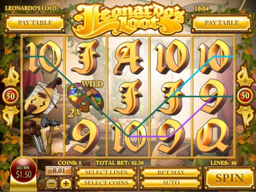 «Добро Леонардо» - это 5-барабанный видео-слот с пятнадцатью картинками (5х3) на главном экране. Вы сможете играть на нем, задействовав от одной до пятидесяти активных линий, на которых будут формироваться оплачиваемые комбинации. Ставки по ним автоматически выравниваются. Они бывают до десяти монет достоинством 0.01, 0.05, 0.10 или 0.25 евро. Соответственно, на раунд принимается от одного цента до ста двадцати пяти евро.