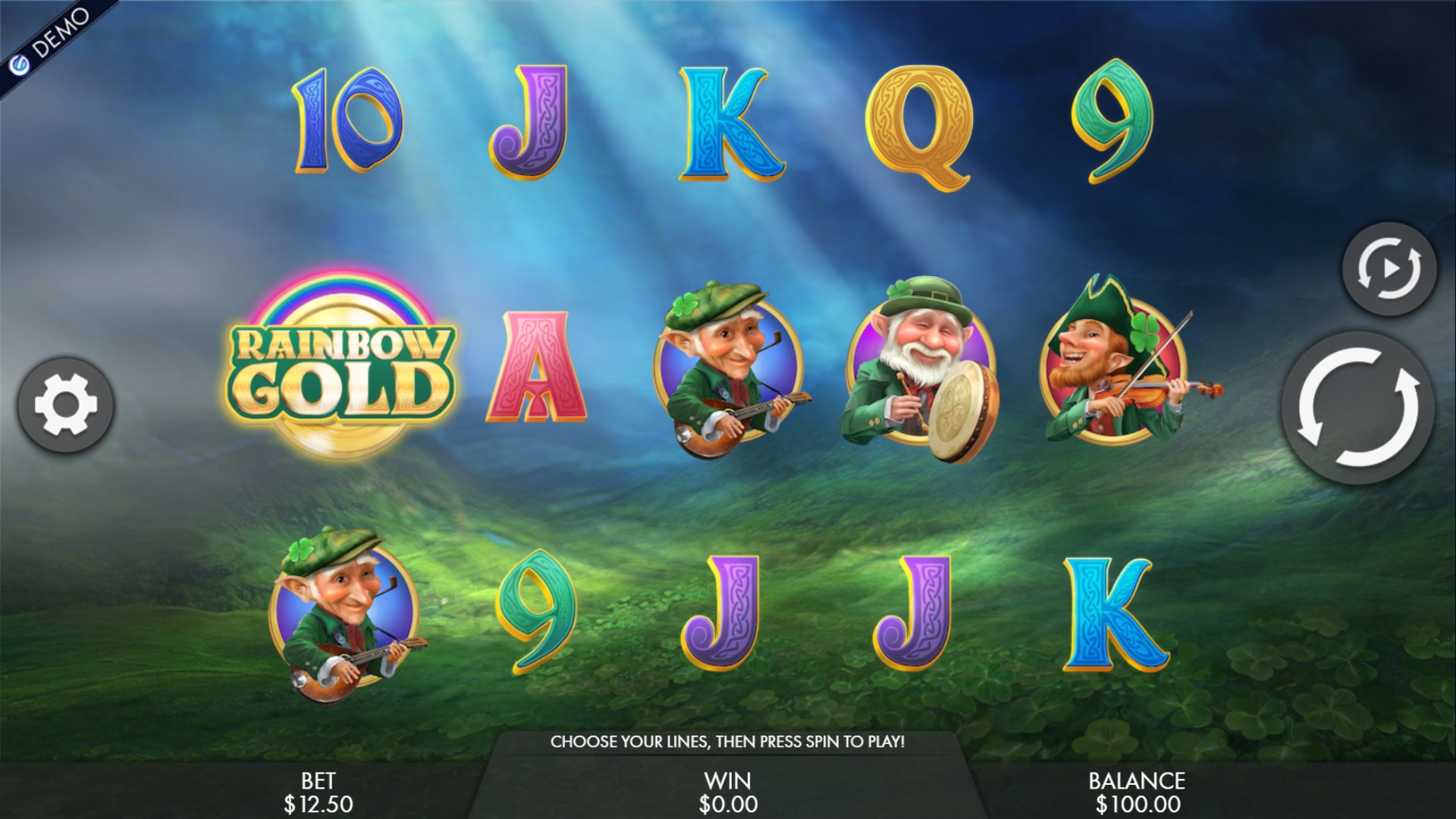 «Легенды о лепреконах» - это игровой аппарат с пятью барабанами, пятнадцатью картинками на основном экране и пятьюдесятью линиями для формирования на них комбинаций. Все полосы задействованы по умолчанию, и вы не сможете менять их количество.