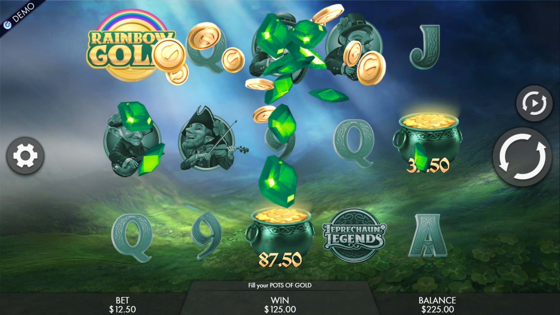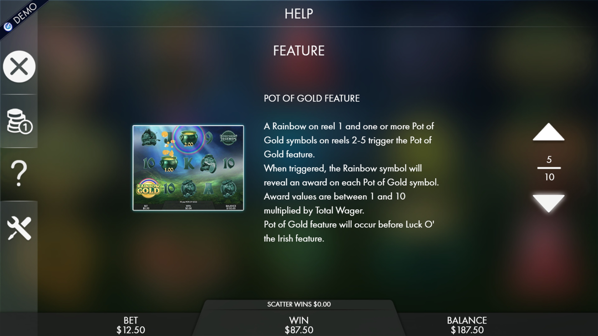 - Pot of Gold начинается, когда на первом барабане оказывается радуга, а где-нибудь в другом месте выпадает хотя бы один горшок с золотом. Каждый из этих кладов принесет вам выигрыш в размере от одной до десяти общих ставок.