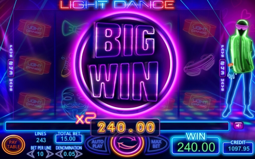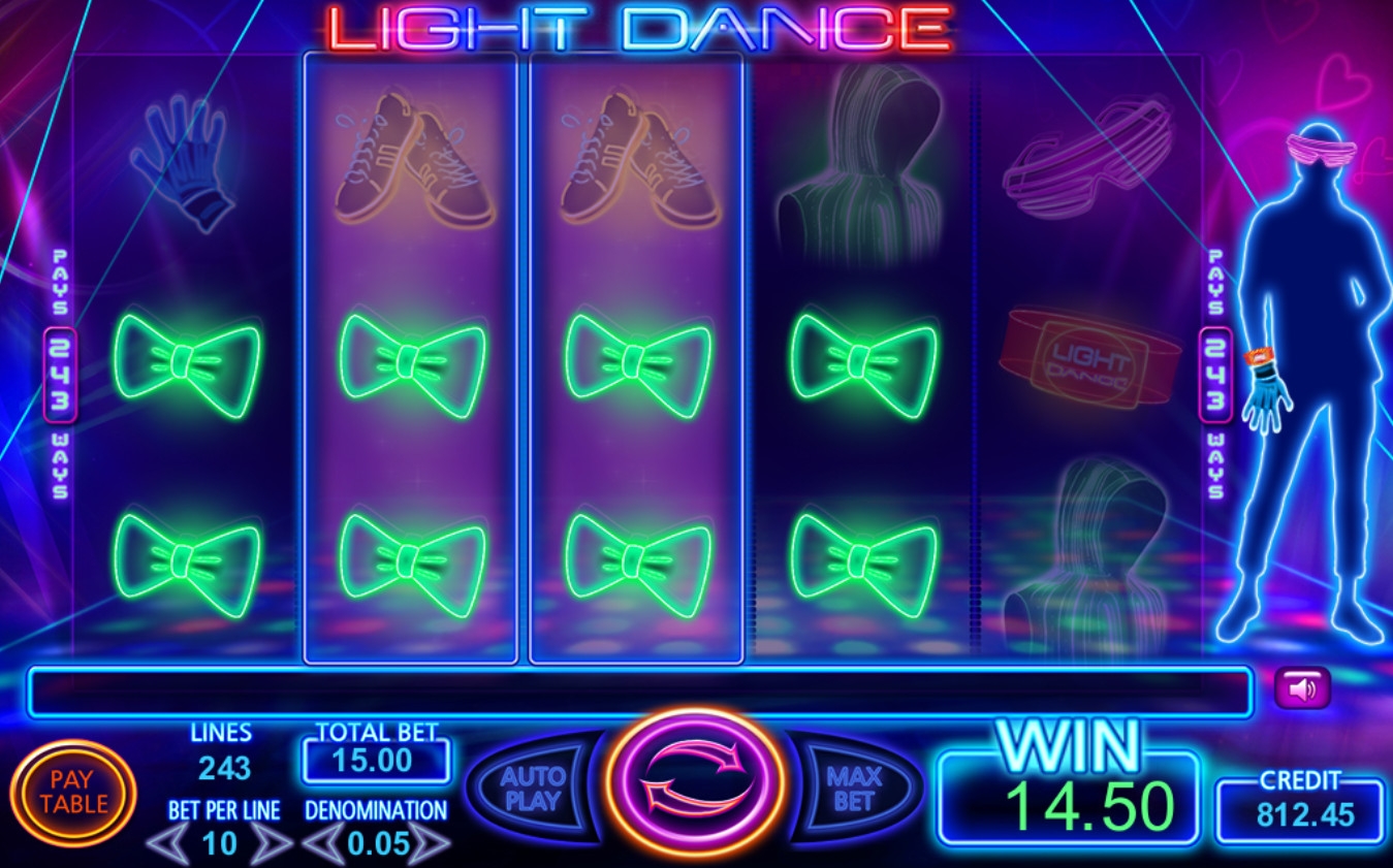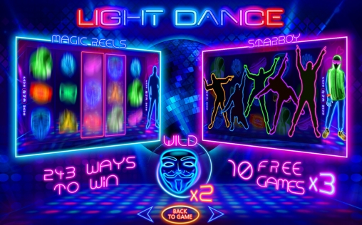 Видео-аппарат Light Dance интересен стильным дизайном и небанальной системой запуска фри-спинов. Наличие джокеров и дополнительных множителей делает геймплей особенно привлекательным. Также отметим удобный интерфейс, приятную музыку и интуитивно понятную систему управления геймплеем.