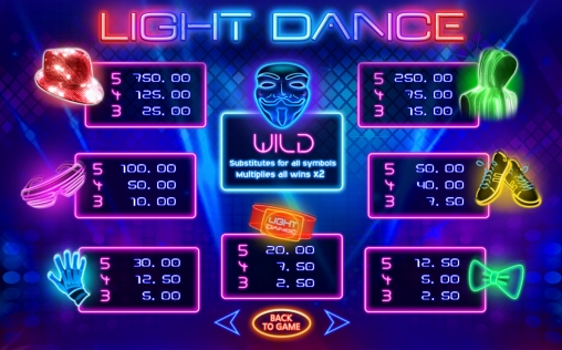 Для расчета выплат предусмотрены коэффициенты от х5 до х1500. Они умножаются на текущую ставку (1/30 часть общей суммы на кону). Игры на удвоение в Light Dance нет, поэтому деньги сразу выводятся на основной счет.