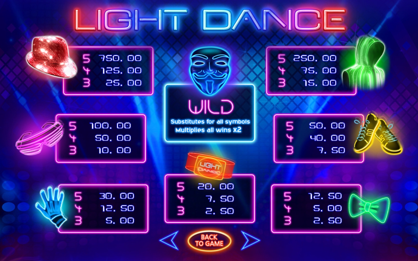 Данный обзор познакомит читателей Casinoz c моделью Light Dance студии Felix Gaming. В ходе игры вы будете собирать для артиста элементы одежды, украшенные неоновыми огнями. Как только сценический костюм будет готов, начнется восхитительное танцевальное шоу в течение очень выгодных фри-спинов.