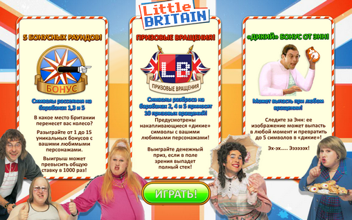 А компания Ash Gaming даже выпустила русифицированный бесплатный игровой автомат Little Britain, посвященный всемирно известному шоу. Надо сказать, модель получилась очень даже удачная, в чем вы сами сможете убедиться, прочитав обзор игры от Casinoz и лично ее испытав.