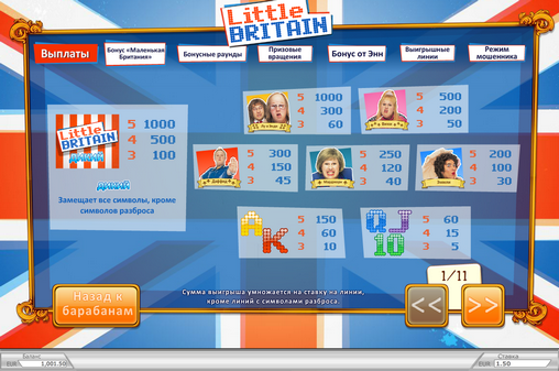 Нет необходимости объяснять, как пользоваться игровым автоматом Little Britain, потому что он полностью и очень качественно русифицирован. Все кнопки подписана, а таблица выплат, состоящая из одиннадцати страниц, предоставляет краткую информацию по всем аспектам. Более подробные данные есть в справочном разделе.