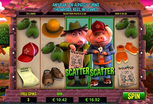 Смешные повзрослевшие поросята из известной сказки сразу создают хорошее настроение. Интерфейс интуитивно понятен и отсутствие русского языка абсолютно не мешает. Очень порадовали частые бесплатные спины.