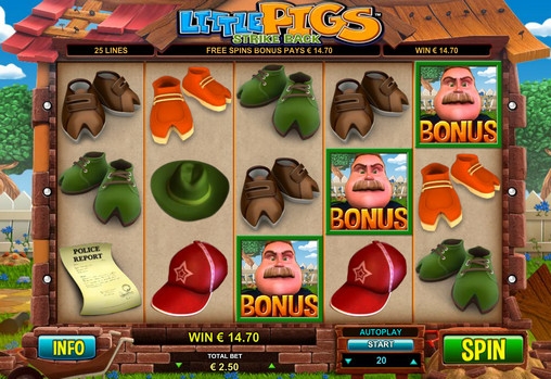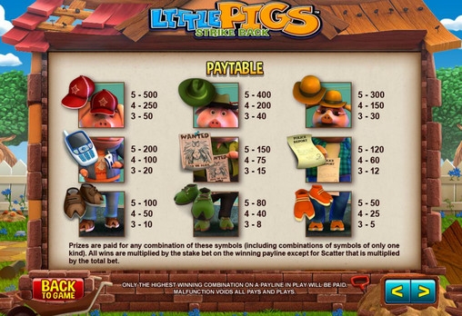 3D видео-слот Little Pigs Strike Back имеет пять барабанов и двадцать пять линий. Все доступные линии постоянно активны. Менять их количество нельзя. Картинки на экране игрового автомата выстраиваются в три ряда. Набор функций включает в себя особые символы с расширенными возможностями, бонусный раунд с бесплатными спинами и некоторые другие опции.