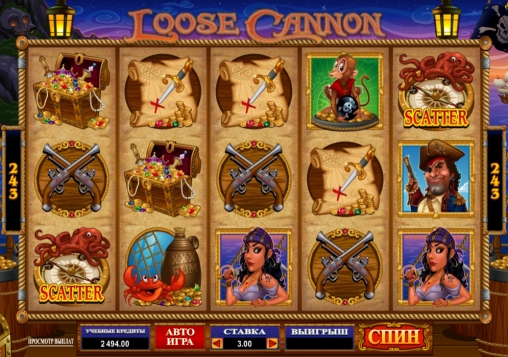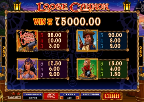 Играть на игровом автомате Loose Cannon можно по ставке на спин в одну-пять монет номиналом до двадцати пяти центов. На спин принимается до 37.5 долларов.