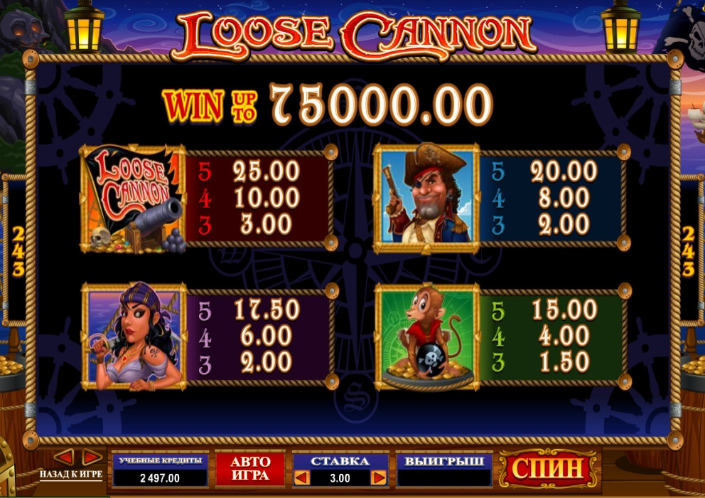 Игровой автомат Loose Cannon предлагается в том числе на русском языке, поэтому не будем объяснять, какие функции выполняют различные элементы интерфейса.