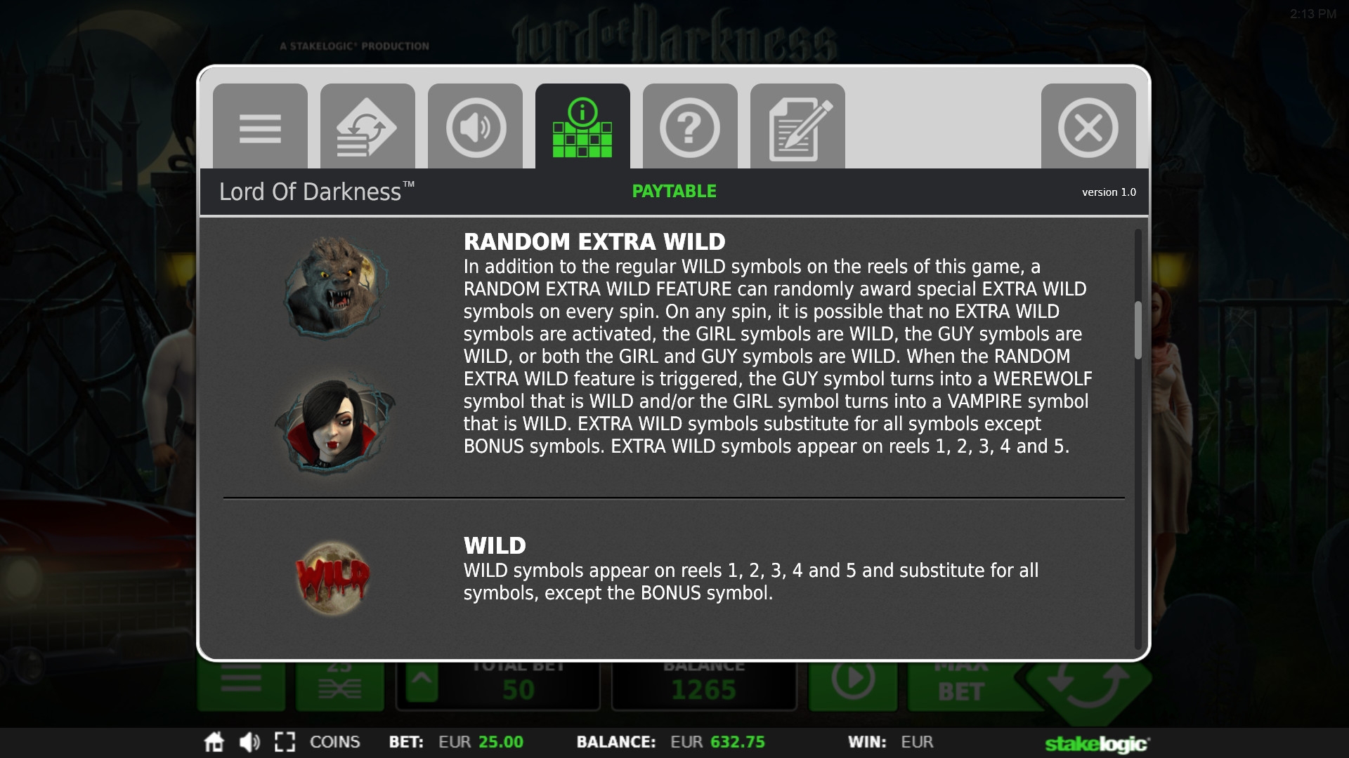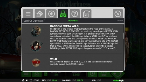 - Random Extra Wild (оборотень или вампир) играет роль дополнительного джокера при активации призовых функций.