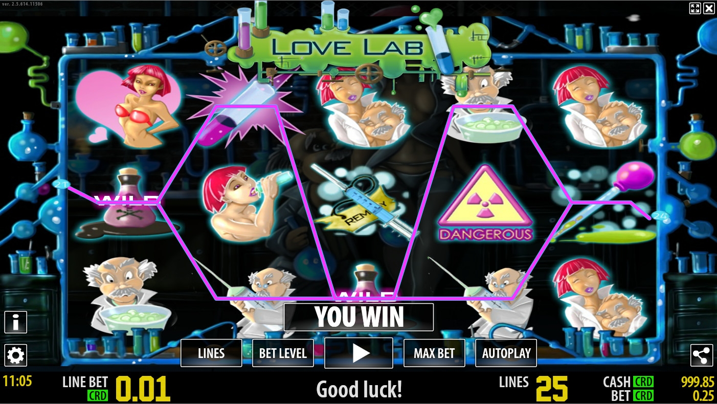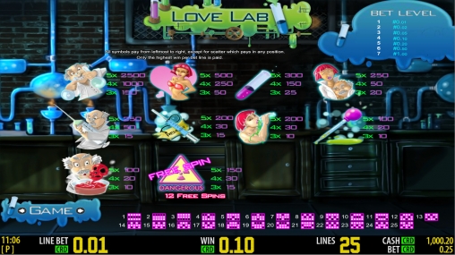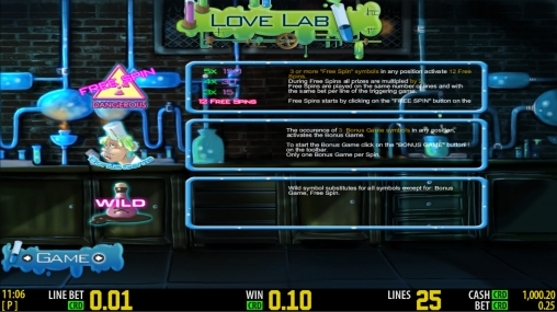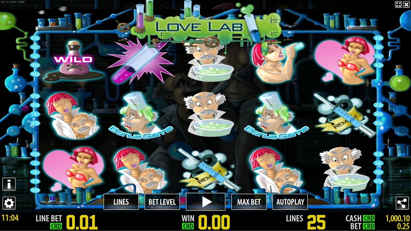 Игровой аппарат Лаборатория любви ярко и красочно оформлен но в целом стандартный имеет пять барабанов двадцать пять линий.Прогрессирующего джекпота нет но зато есть щедрая бонусная линия.