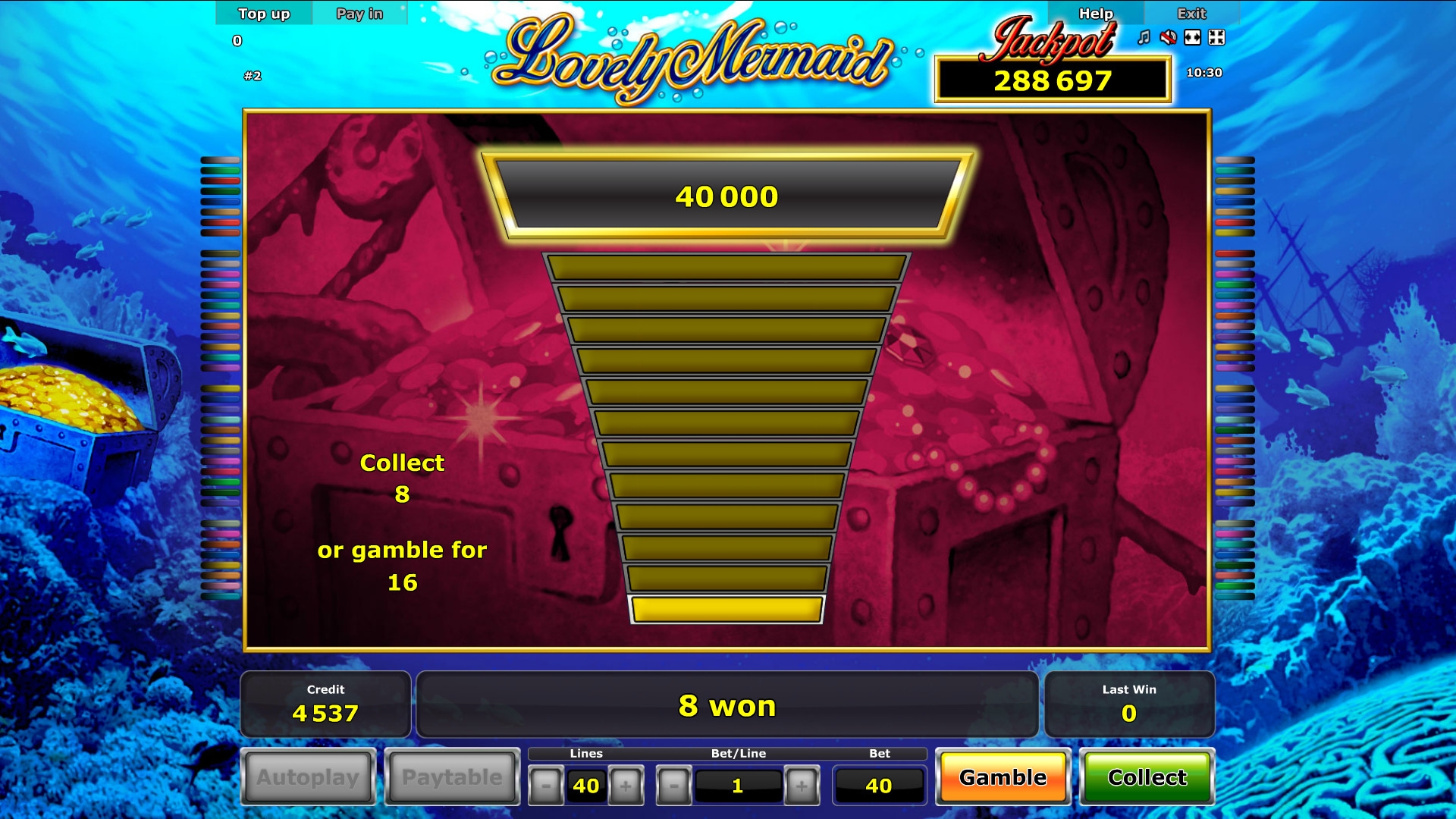 Создатели явно расчитывали автомат на маленьких девочек, фанаток мультика про русалчку. Жаль что девочкам до 18-ти играть в слоты нельзя, им бы понравился. Добротный 40-ка линейник, жаль опять бонусную игру спинами бесплатными заменили.