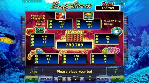 «Прелестная русалочка» - это 5-барабанная слот-машина, на которой можно играть по одной – сорока активным линиям. Количество задействованных полос выбирает пользователь. Ставки по всем позициям неизменно равны. По каждой из них можно ставить от одного до двухсот кредитов (1 – 8000 монет на спин).
