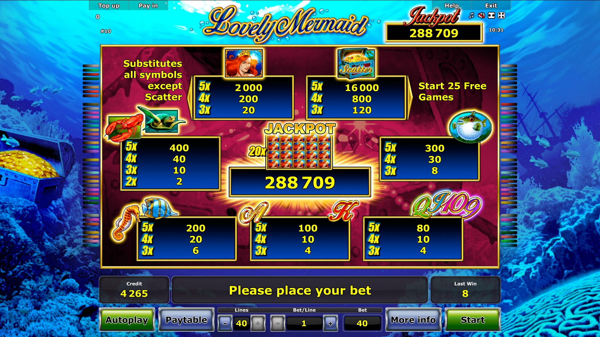 Игра по мотивам сказки извсетной нам еще с раннего детства - Русалочка. По структуре -5 барабанов и на выбор до 40 активных линий. В игре присутствуют особые тематические бонусные символы, джекпота нет.