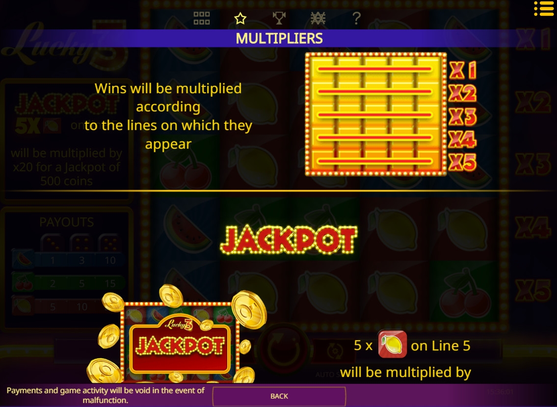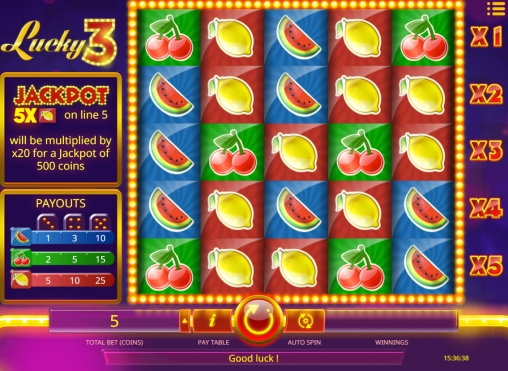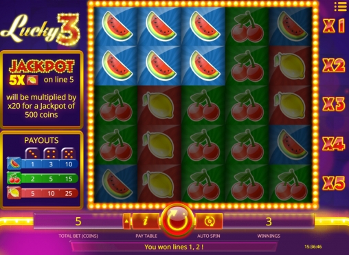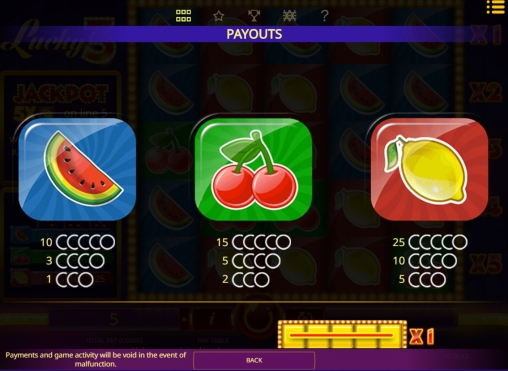 Как уже говорилось выше, в Lucky 3 задействованы три картинки. Также есть система дополнительных множителей и фиксированный джекпот.