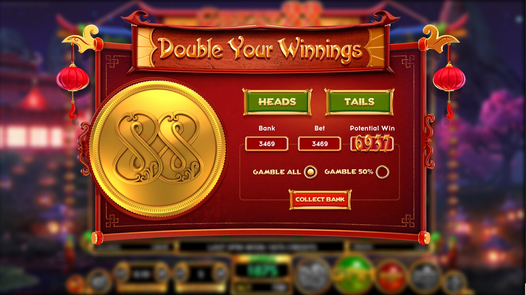 В Great 88 есть раунд на удвоение выплаты. Он проходит на дополнительном экране. На кон можно ставить весь выигрыш или его половину. Вам нужно будет сыграть в «орел или решка». Правильный ответ удваивает сумму, а ошибка означает проигрыш ставки. Максимального лимита нет.