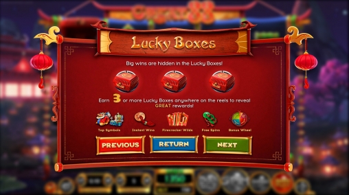 - Bonus (красные шкатулки) представлены на всех барабанах. Три таких символа, выпавших в любых ячейках на экране, дают старт призовому раунду Lucky Boxes.