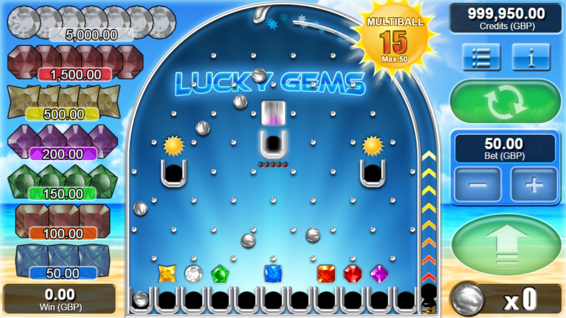 Ход игрыРозыгрыш начинается с выбора ставки. Затем вы должны нажать самую большую кнопку на панели. На ней изображена белая стрелочка. Из желобка вылетят двенадцать шариков, который будут приземляться в разных ячейках. Слева будут фиксироваться полученные вами камни.