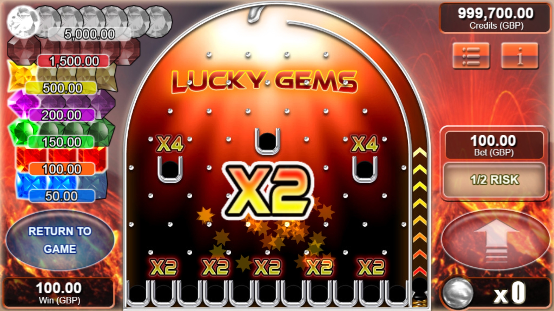 Если вы получили выплату, вы можете начать игру по равным шансам, поставив на кон весь выигрыш или половину суммы. В таком случае будет запущен один шарик. Над пятью ячейками будет надпись x2, а над двумя – х4. Если шарик остановится в любой из них, выплата будет увеличена, соответственно, в два или четыре раза. Если же он окажется в пустой ячейке, вы лишитесь денег. Играть можно несколько раз подряд. Закончить раунд можно на любом этапе.