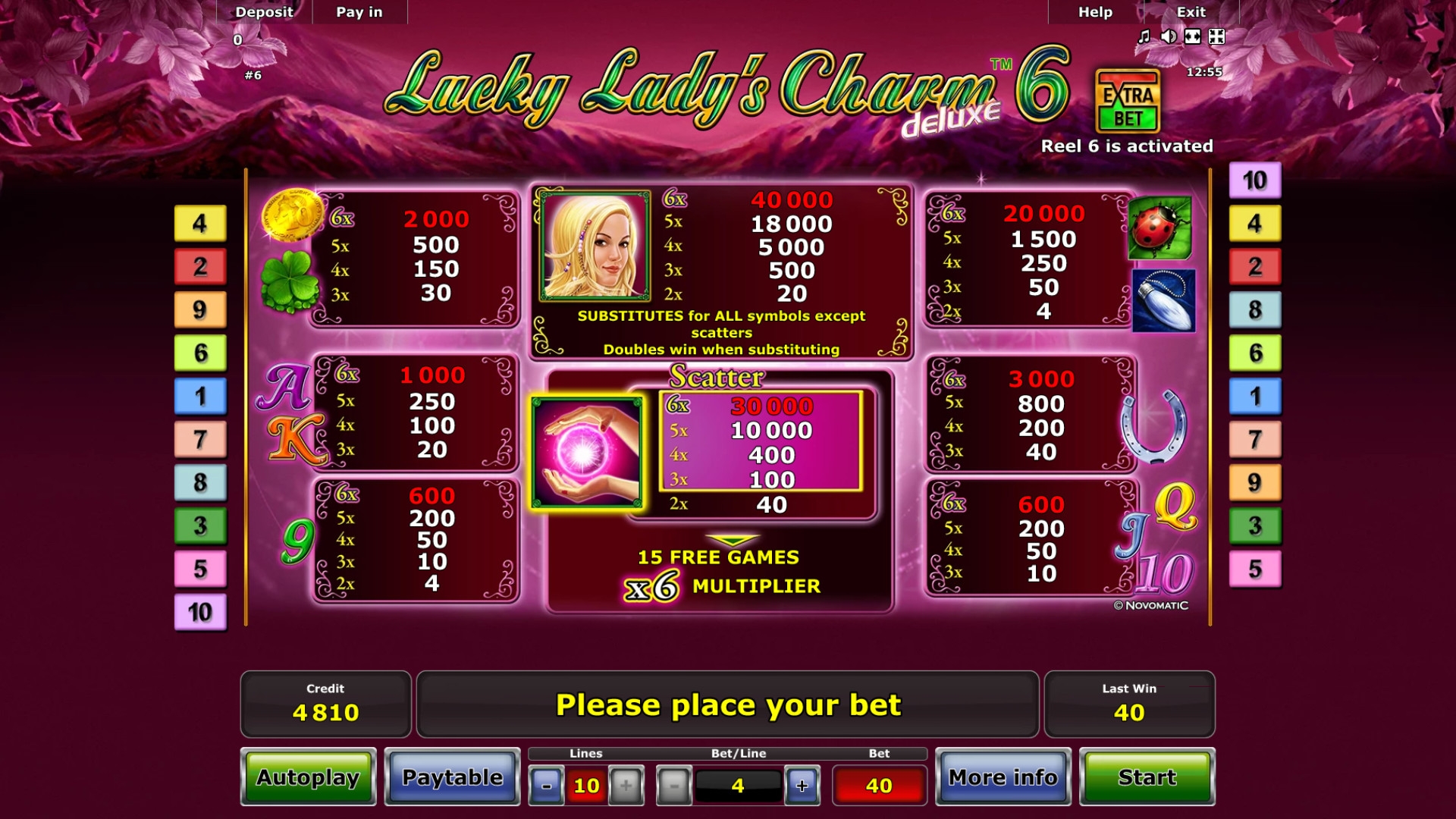 Lucky Lady’s Charm 6 Deluxe прогрессивный джекпот «Новоматик» не разыгрывается.