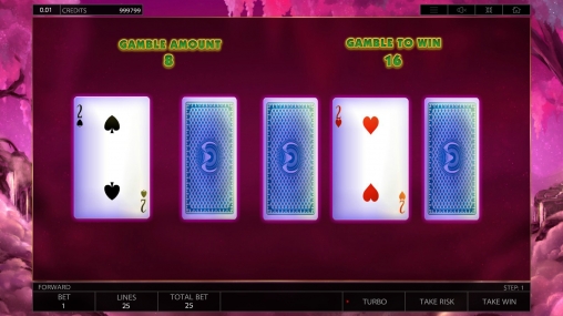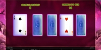 Начисленные кредиты можно вывести на баланс или рискнуть деньгами в раунде на удвоение. Он проходит в стиле, более характерном для видео-покера. На экране появляется открытая карта и четыре закрытых, из которых вам нужно выбрать одну. Если она побьет карту виртуального дилера, выплата увеличится в два раза. Также можно проиграть деньги или завершить игру в ничью.