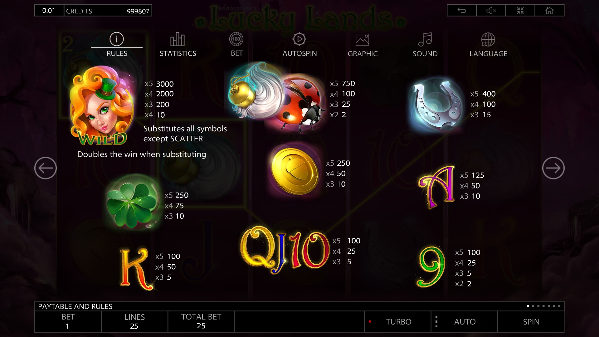На барабанах изображены предметы, ассоциирующиеся с привлечением удачи: четырехлистный клевер, божья коровка, подкова и другие. Также на экране появляются буквенные и цифровые обозначения карточных номиналов.