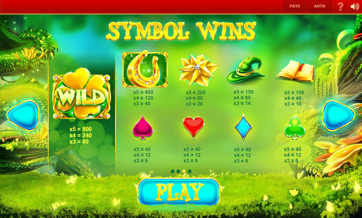 На барабанах автомата можно увидеть шляпу волшебника, золотой медальон в виде золотых звезд, подкову на счастье, книгу с заклинаниями и четыре карточные масти. Картинки могут идти в колонках полосами.