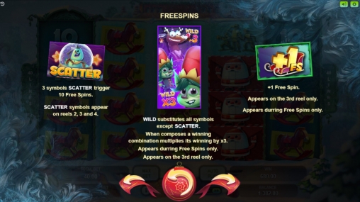 - Scatter (стеклянный шар со снеговиком) представлен во второй, третьей и четвертой колонках. Три скаттера дают старт бесплатным вращениям.