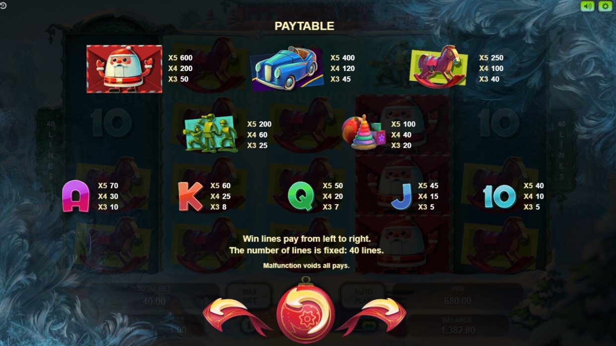 В слот-аппарате «Счастливое Рождество» доступны десять базовых картинок, джокеры, два вида джокеров, скаттеры, дополнительные множители и фри-спины.