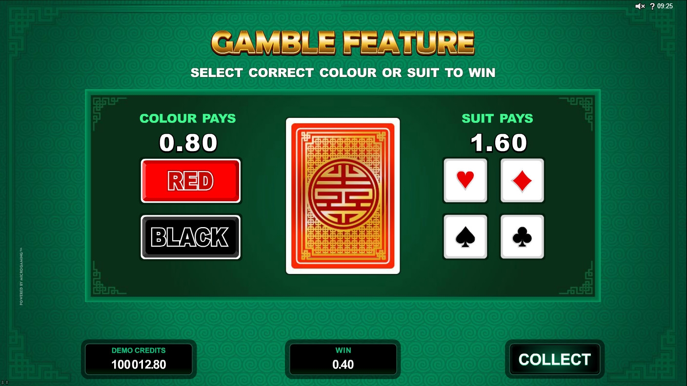 В Lucky Zodiac есть игра по шансам. На кон можно ставить только весь выигрыш. Нужно угадывать цвет или масть карты. Выплата будет удваиваться при правильно названном цвете и увеличиваться в четыре раза при угаданной масти. При ошибке вы лишаетесь денег. Разрешается играть несколько раз подряд.