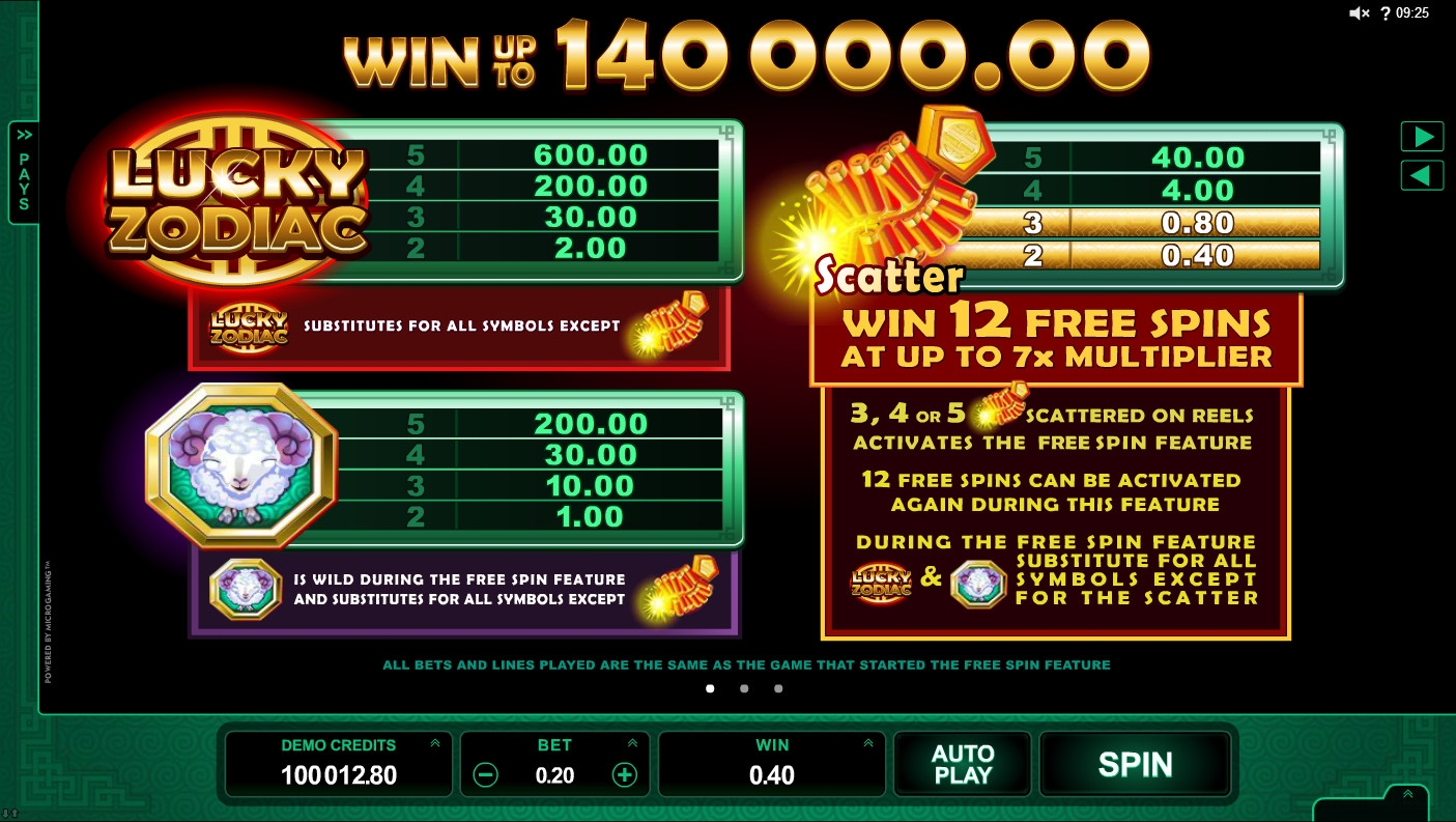 В Lucky Zodiac пять барабанов и три ряда символов на экране. Вы можете задействовать любое количество активных линий от одной до двадцати. На них принимаются равные ставки: до десяти монет на каждую позицию. Номинал чипов варьируется в диапазоне от одного до пятидесяти центов. Таким образом, играть можно даже по одному центу на спин, а максимальная ставка ограничена ста долларами.