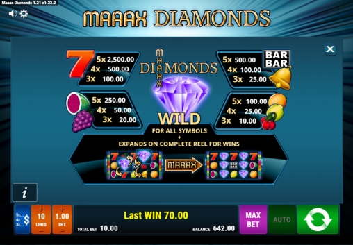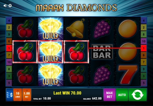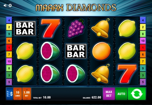 Мы рассматриваем пятибарабанный онлайн-аппарат с пятнадцатью картинками на основном экране. Играть в Maaax Diamonds можно по пяти или десяти активным полосам.