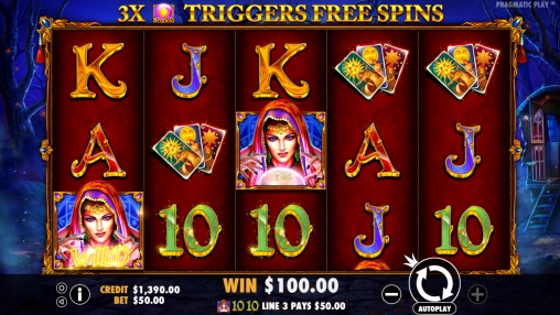 - Wild (гадалка) составляет комбинации даже из двух символов, а также дополняет цепочки из других изображений, кроме скаттеров. Если джокер заменяет прочие картинки, он удваивает коэффициенты.
