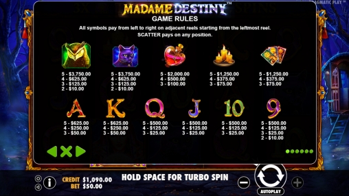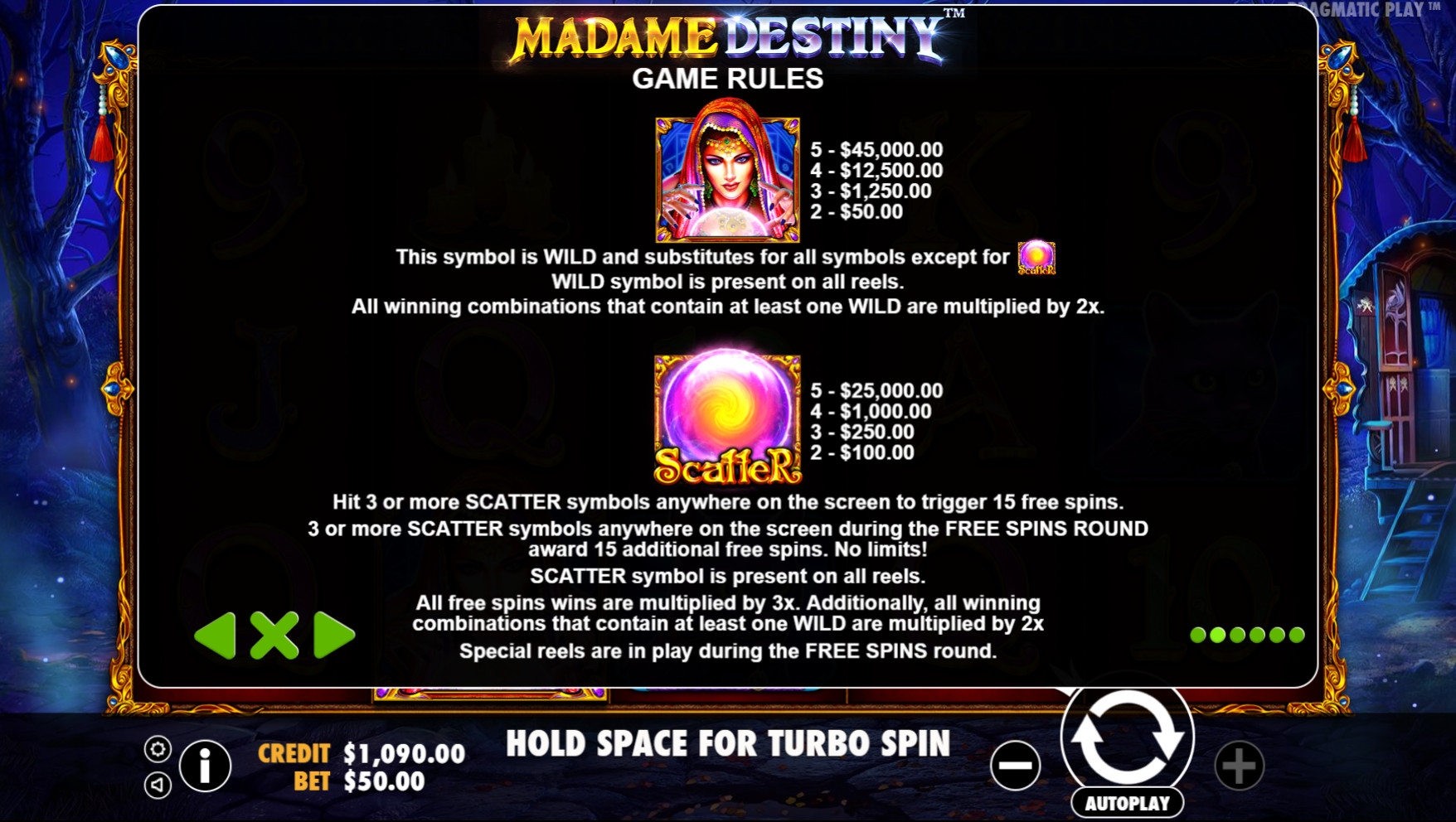 Компания Pragmatic Play не предлагает накопительный джекпот в Madame Destiny.