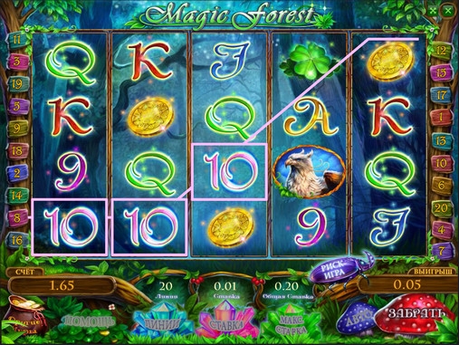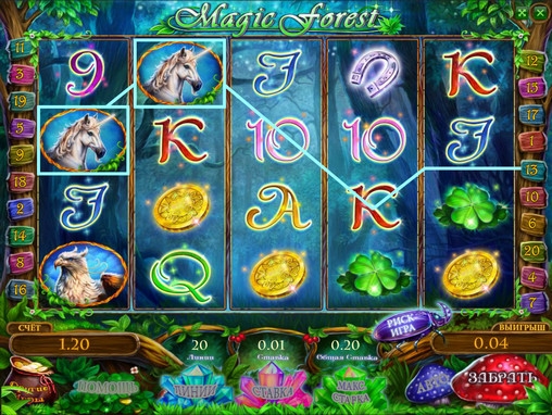 Magic Forest – видео-слот онлайн с пятью барабанами, тремя рядами картинок и двадцатью линиями, количество которых можно активировать по усмотрению пользователя. В нем есть особые символы, бесплатные спины с дополнительными множителями, игра по шансам и другие опции.