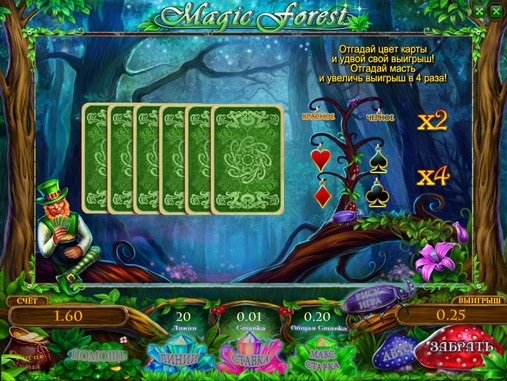 В Magic Forest также есть риск-игра по шансам, в которой предлагается возможность увеличить общую выплату за спин. Чтобы удвоить сумму, нужно будет с первой попытки угадать цвет закрытой карты. Чтобы попытаться умножить ее в четыре раза, необходимо назвать масть. Права на ошибку нет. Счастливчики могут угадывать несколько раз подряд в одном раунде.