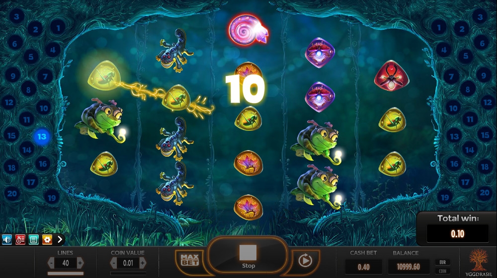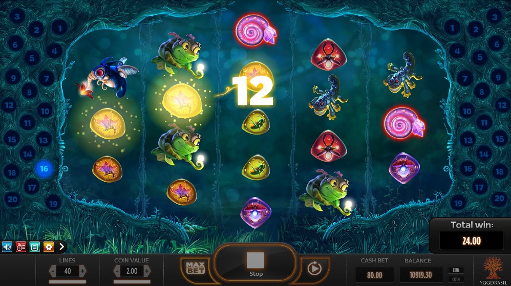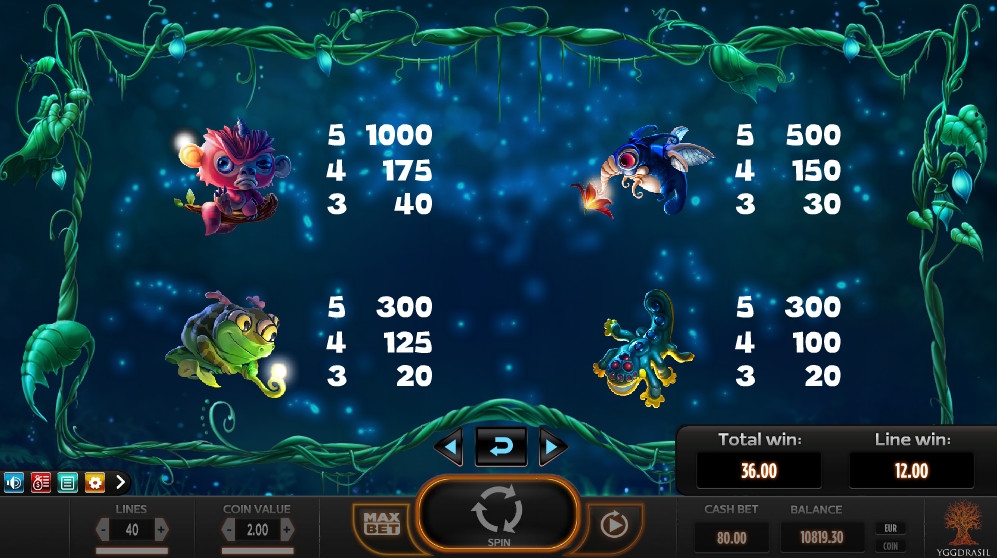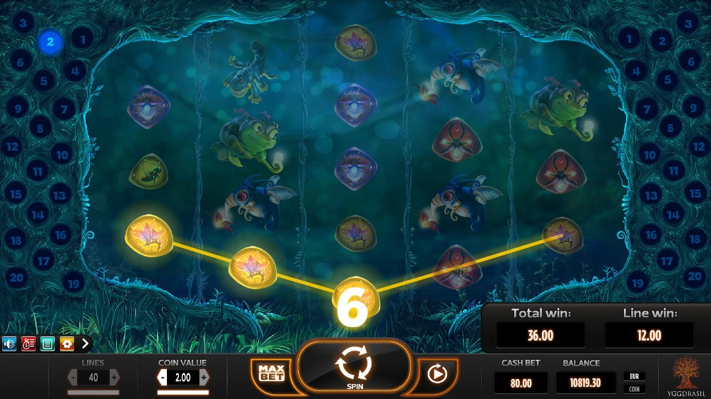 По факту, в пятибарабанном видео-слоте Magic Mushrooms двадцать линий (вы найдете схему их расположения в правилах). Но, так как комбинации на них формируются с двух сторон (справа налево и слева направо), считается, что их сорок. Ставка на каждую из них может быть от одного цента до двух евро, а на раунд разрешается ставить до восьмидесяти евро.