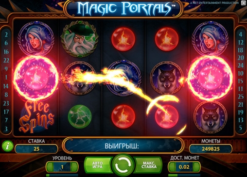 - Free Spins запускают десять бесплатных спинов по текущей ставке и количеству линий. В видео-слоте Magic Portals они начинаются, когда Free Spins одновременно оказываются в двух порталах. Во время этих запусков на пятом барабане образуются два дополнительных магических портала. Спины могут продлеваться.