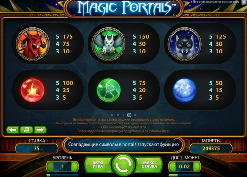 Играть на игровом автомате Magic Portals можно по одной – десяти монетам на линию, номинал которых варьируется от одного цента до одного евро. Следовательно, общая ставка на спин достигает двухсот пятидесяти евро.