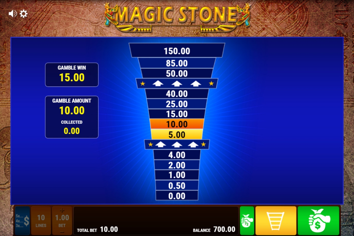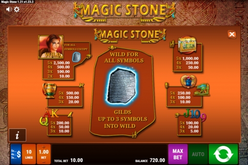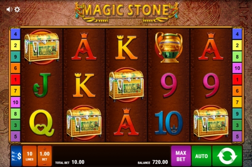 Играть на пятибарабанном автомате «Волшебный камень» можно лишь по десяти активным полосам. На них принимаются одинаковые ставки: от 0.01 до 2 долларов на каждую. Общая сумма на кону варьируется от 0.10 до 20 долларов.
