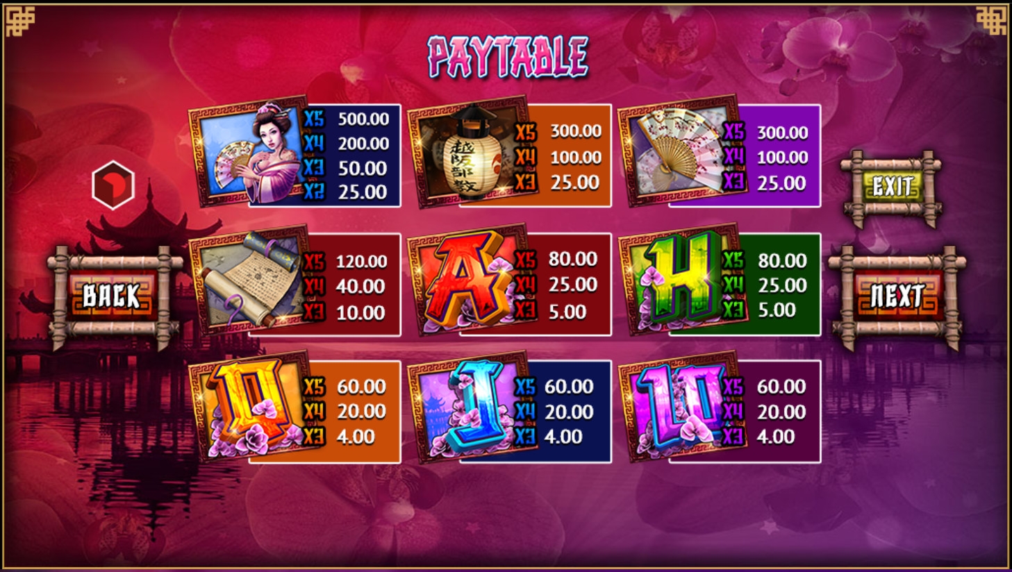Вы увидите пять номиналов игральных карт, свиток с иероглифами, традиционный веер, бумажный фонарик и прелестную китаянку. Одинаковые элементы могут следовать друг за другом цепочками в колонках. Девушка – единственный символ, образующий комбинации даже из двух картинок.